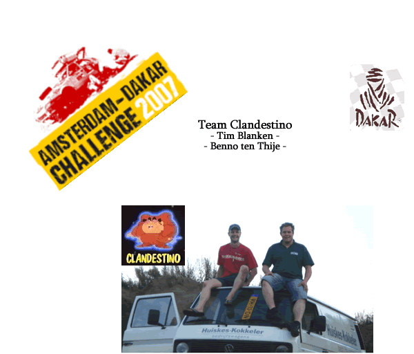 Wat gaan we doen Wij zijn Benno en Tim (team Clandestino) en wij gaan op een originele manier proberen om zoveel mogelijk geld binnen te halen voor het goede doel. Hiervoor ondernemen wij een tocht van 7500 km, dwars door Europa, Marokko, Mauritanie, de Sahara, Senegal door naar Banjoul, de hoofdstad van Gambia. De challange waar wij aan deelnemen is de bekende Amsterdam-Dakar Challange, ook wel de barrelrace genoemd. Zaterdag 17 november 2007 gaan wij van start en zullen in drie weken deze loodzware tocht afleggen voor het goede doel. |